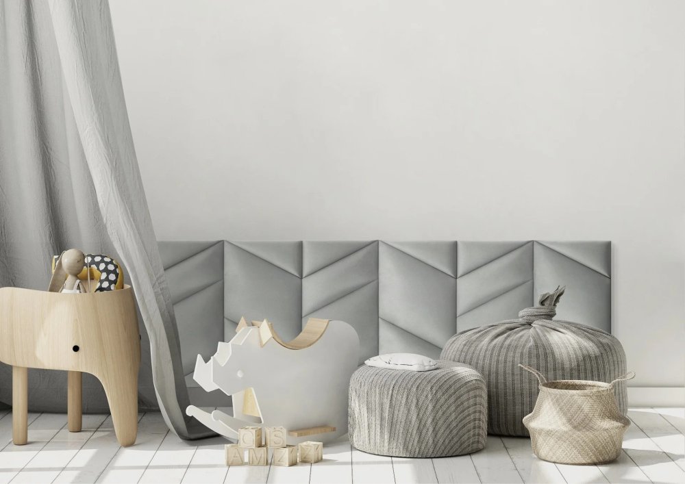 Ty v šedém podání skvěle korespondují nejenom s malbou na stěně, ale také závěsem. Právě dřevěné přírodní hračky se k tomuto odstínu hodí nejvíce. Odpočívací pytle, bílá podlaha, tohle všechno tvoří nápaditý a kreativní celek, jemuž nelze cokoliv vytknout. Čalouněné panely ABIES zde vytvořily příjemnou opírací plochu na omak čili hřejivé zázemí se vším všudy.