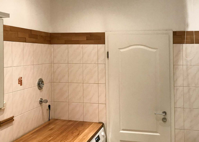 Tato realizace je poněkud odvážná, protože kombinuje dřevěný a keramický obklad. Není jisté, zda šlo o záměr nebo o úmyslné vytvoření ozdoby v koupelně. Obklad z keramické dražby zde nedosahuje do plné výšky dveří. Rozdíl byl kompenzován vytvořením obkladu z 3D lamel z přírodního dubu.