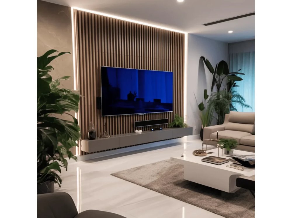 Realizace nástěnných lamelových panelů – Béžové pozadí za televizí