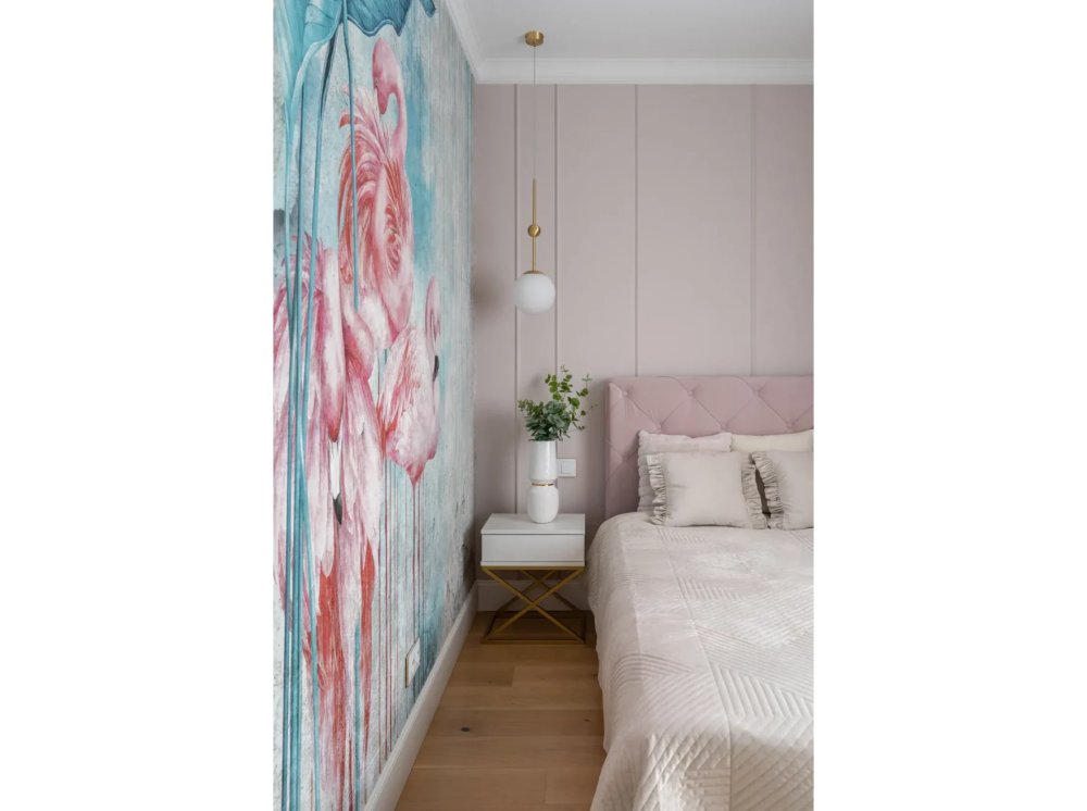 Nástěnná lišta MD003 se pyšní přetíratelným povrchem, díky čemuž byl její vzhled sladěn s malbou na stěně. Vše se v této ložnici řídí poměrně jasným heslem, v jednoduchosti je krása a síla. Nástěnné lišty končí nikoliv u stropu, ale u stropní lišty, což opět podtrhuje promyšlenost i těch nejmenších detailů a utváří vizuálně propracované dílo. Ložnice je nyní mnohem příjemnějším prostředím.
