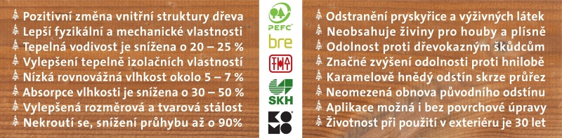 Tento proces tepelné modifikace má trvalý vliv na vlastnosti dřeva a poskytuje tak vynikající trvanlivost, rozměrovou stabilitu a mechanické vlastnosti. Zlepšené vlastnosti dřeva ThermoWood® snižují potenciál smršťování, prohýbání nebo kroucení a zajišťují, že si finální výrobek udržuje nový vzhled po dlouhou dobu.