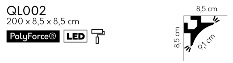 Stropní LED osvětlovací lišta, NEPŘÍMÉ OSVĚTLENÍ, tvrdý plast PolyForce (HD Polymer), základní bílý nátěr (přetíratelný), 85 x 85 x 2000 mm