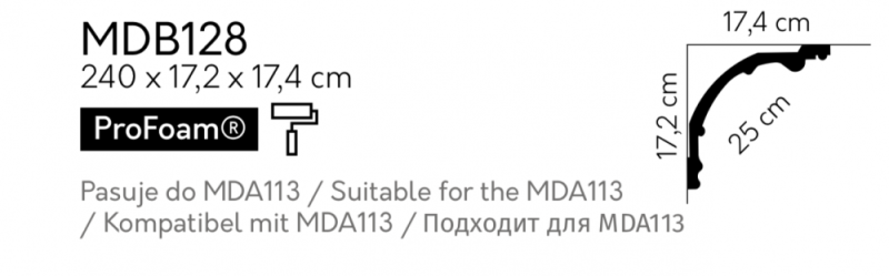 Stropní lišta – HLADKÁ, tvrdý plast ProFoam® (polyuretan), základní bílý nátěr (přetíratelný), 178 x 170 x 2000 mm
