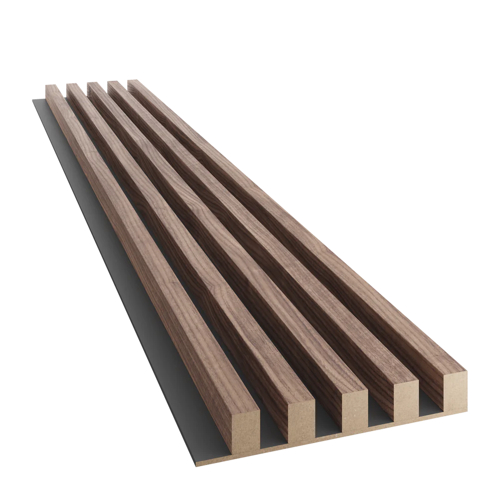 Dřevěné lamely ŠIROKÉ na ČERNÉ desce (MDF), OŘECH DÝHA, 46 x 300 x 2750 mm (0,825 m2)