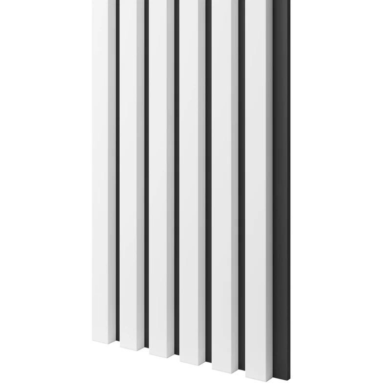 Dřevěné lamely ÚZKÉ na ČERNÉ desce (MDF), BÍLÁ MATNÁ, FINISH FOLIE, 24 x 300 x 2750 mm (0,825 m2)